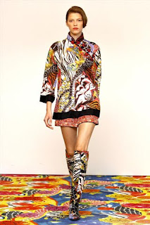 Philosophy's spring line features very bold colors and graphic prints, and channels an Asian vibe with the kimono jackets and wide rice farmer-inspired hats. But the mini skirts and dresses, the wide sleeves, and tall boots suggest a 70's era vibe as well.